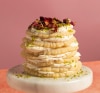 الخطوة ٦: لمزيد من الأفكار، يمكن أيضاً التزيين بالفستق الحلبي المهروس أو بتلات الورد المجففة. وفي حال الرغبة بجعل التزيين عصرياً أكثر، تضاف بضعة رقائق من الشوكولاتة أو بسكويت لوتس المهروس.