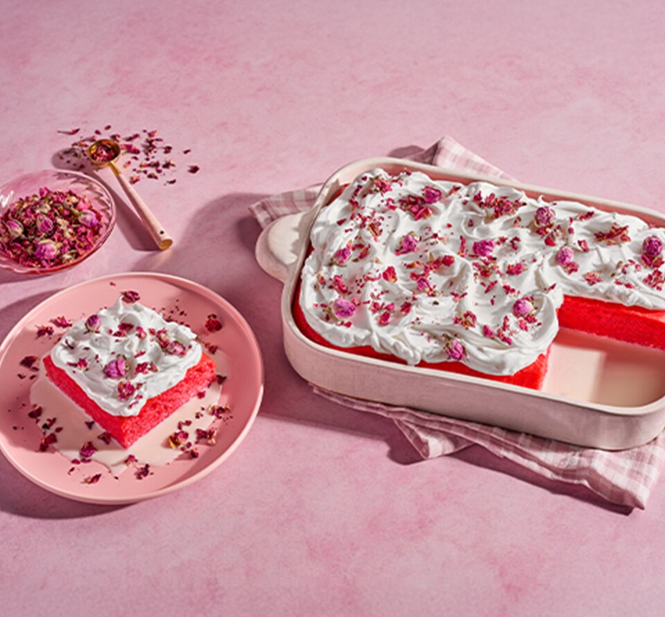 تُغطّى بطبقة من كريمة الخفق وتُزيّن ببتلات الورد المجففة، ثم تُقدّم.