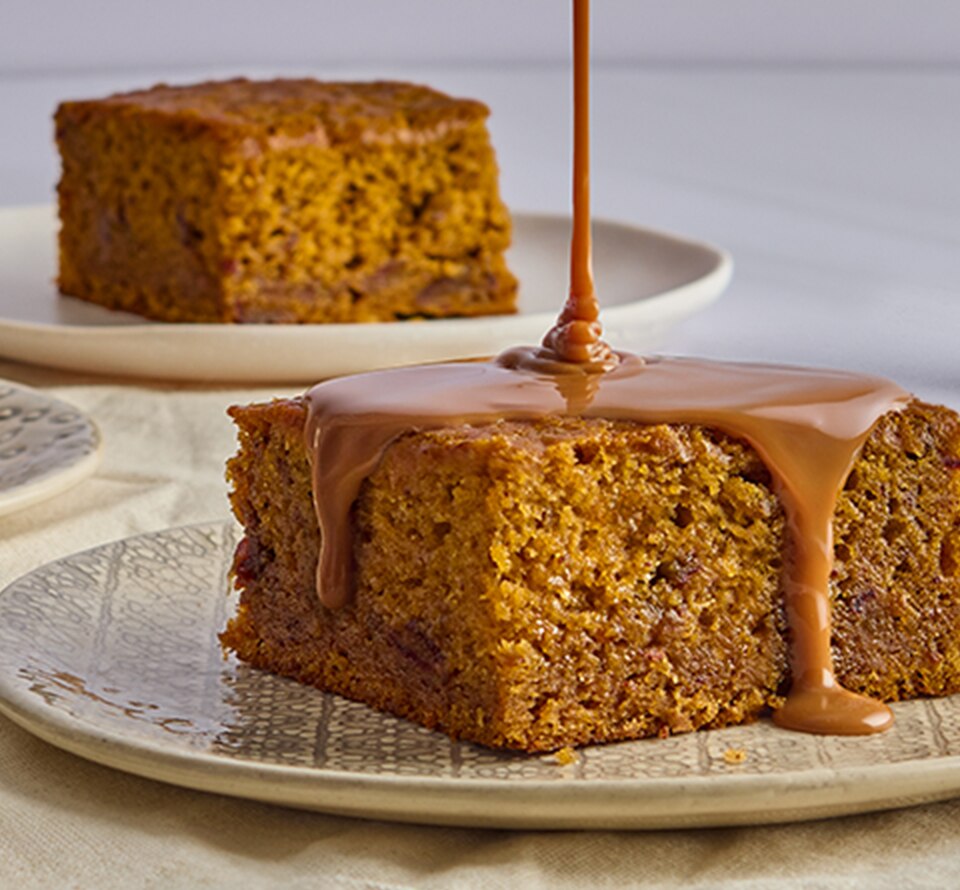 Poke holes in the warm pudding. Pour half the toffee sauce over it to soak.
